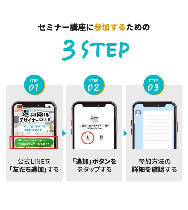 最初のステップとしては、セミナーで基本的なデザイナーとしてのマインドからスキルや受注する方法を学ぶことができます。 その後は、個人のペース次第で実際の依頼に対応しながらスキルを深めていくことを推奨しております。